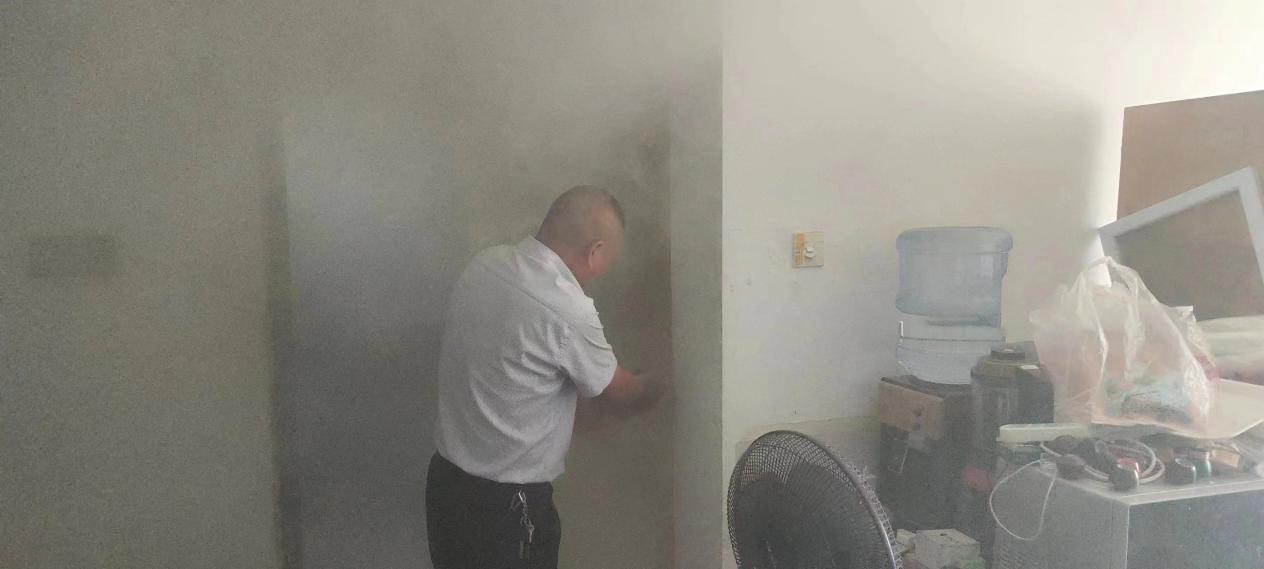 10月24下午15点28分,保安员在进行日常巡查时,发现7栋东单元楼上冒出浓烟,立即用对讲呼叫消控室值班人员启动火灾应急预案并立即上楼查看。15点32分项目经理、保安队长、工程主管迅速到达,立即上楼排查。他们在抵达失火楼层时浓烟扑面而来看不清现场,逐户派排查最终确定为1305室传出浓烟。在连续重拍门无回应后,保安队长破门而入,保安员迅速携带消防设备进行灭火工作,连续消耗5瓶干粉灭火器将火势控制。他们在扑灭初起火源的同时,迅速引导户内小孩、老人撤离现场。
