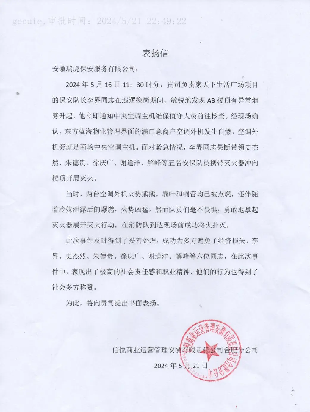 2024年5月22日,瑞虎保安公司收到信悦商业运营管理安徽有限责任公司合肥分公司的表扬信,信中对瑞虎保安派驻家天下生活广场的保安队员们进行了感谢和表扬。
