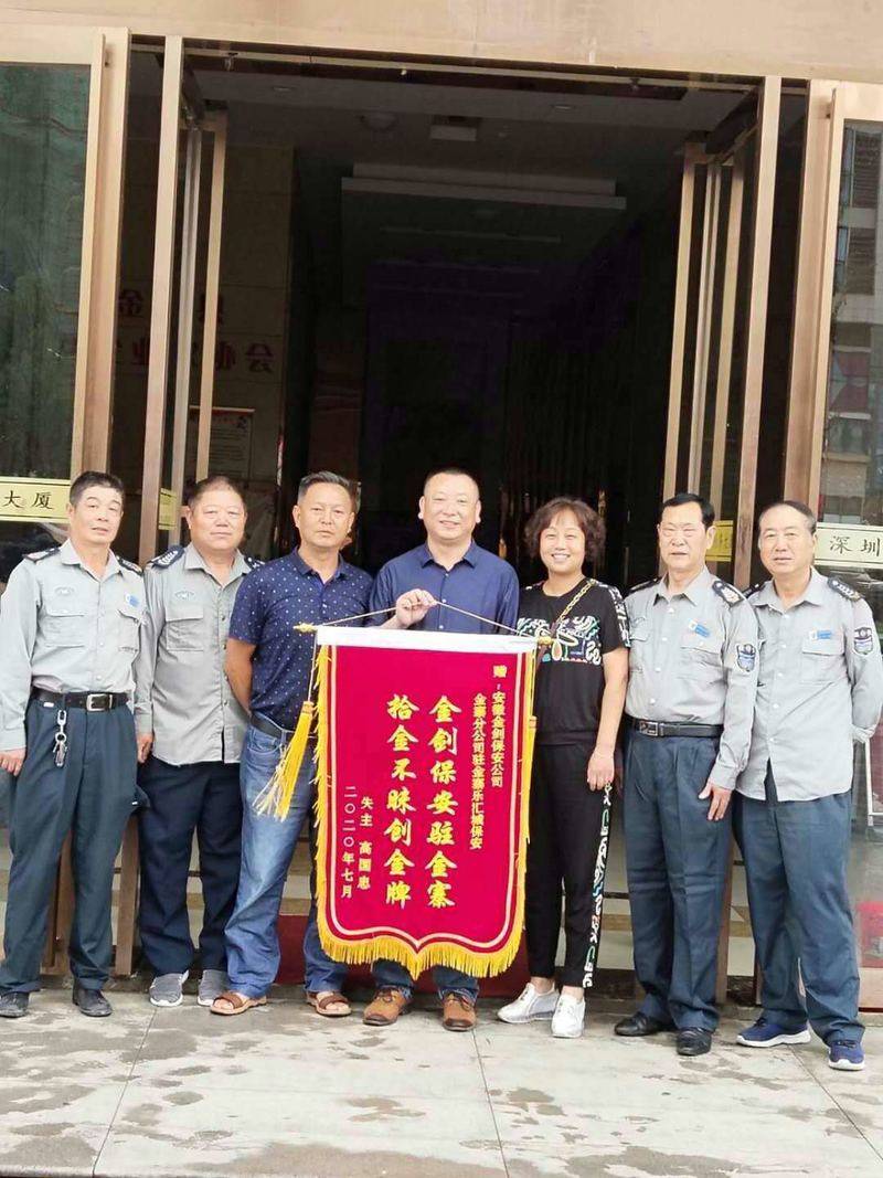 7月15日下午,金寨关庙实验中学高国忠老师来到安徽金剑保安服务有限公司金寨分公司,赠送一面题为“金剑保安驻金寨,拾金不昧创金牌”锦旗,并向分公司经理林玲、保安员解厚敏表示感谢。