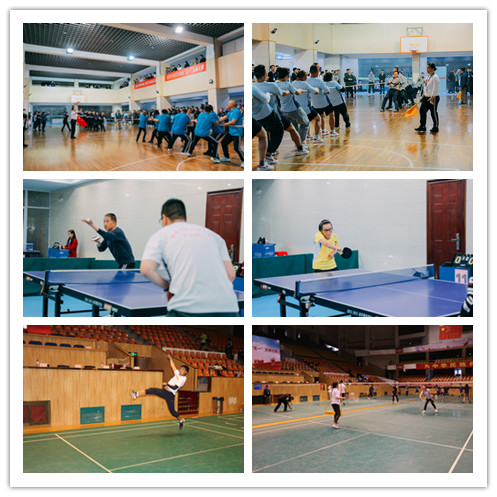 比赛开始,拔河、羽毛球男(女)子单打、乒乓球男(女)子三大类、五项团体和单人比赛在各自场馆内同步开赛。拔河赛场上,随着一声嘹亮的哨音响起,双方参赛选手卯足了劲,抓紧绳子全力以赴,一次次的极限拉扯,一次次的顽强坚持,麻绳中间的红丝带不断地左右挪移,选手们个个涨红了脸……赛场外啦啦队看得热血沸腾,情绪高涨,助威声、加油声此起彼伏,掀起了比赛的阵阵高潮。