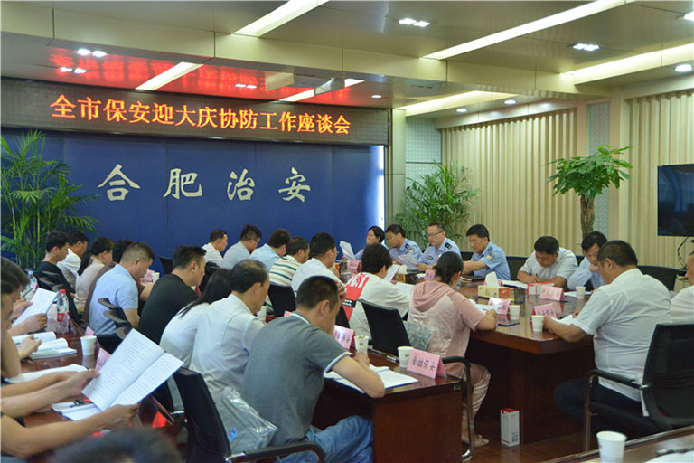 为了充分发挥保安力量在社会治安防控体系中的重要作用,扎实开展好“践行新使命,忠诚保大庆”主题实践活动,努力为国庆70周年营造安全稳定的社会环境,6月6日下午,合肥市公安局治安支队组织合肥市保安协会三十家会员单位主要负责人,在支队三楼会议室召开全市保安迎大庆协防工作座谈会。治安支队党总支委员、副调研员王家军,治安支队保安管理处相关负责人,合肥市保安协会秘书长张传林、合肥保安集团有限公司总经理苏孙铭等三十家保安服务公司主要负责人参加会议。会议由王家军委员主持。