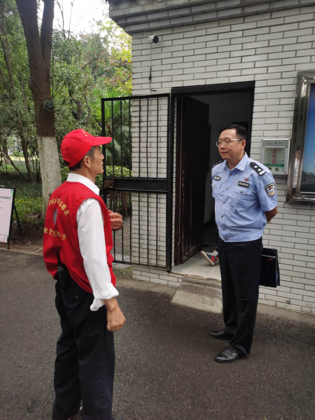 督察人员亲切询问某公园保安员,了解情况同时,督促保安员穿制服