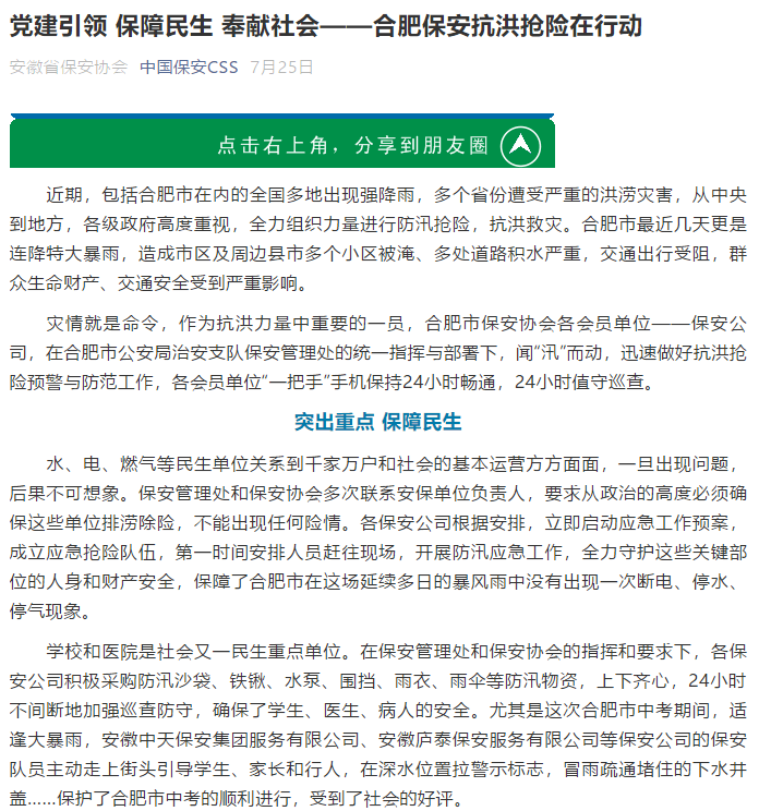 党建引领,保障民生,奉献社会 ——合肥保安抗洪抢险在行动